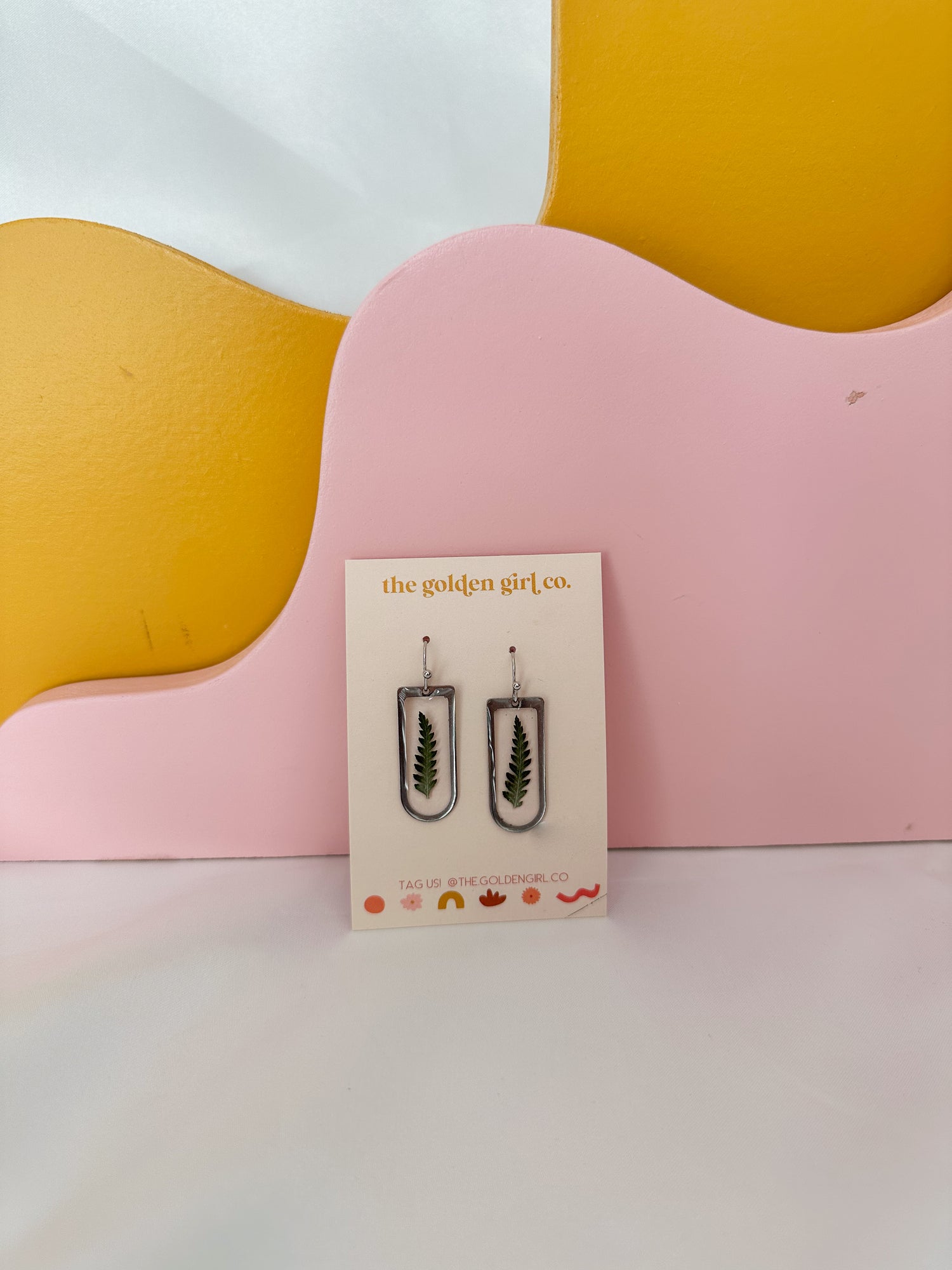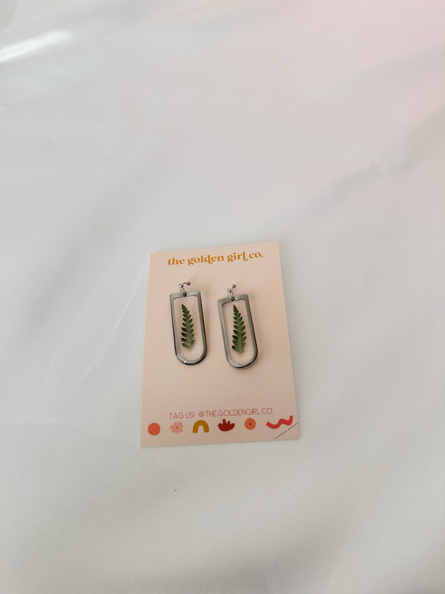 Real pressed ferns preserved in resin. Hypoallergenic, gold plated ear hooks.