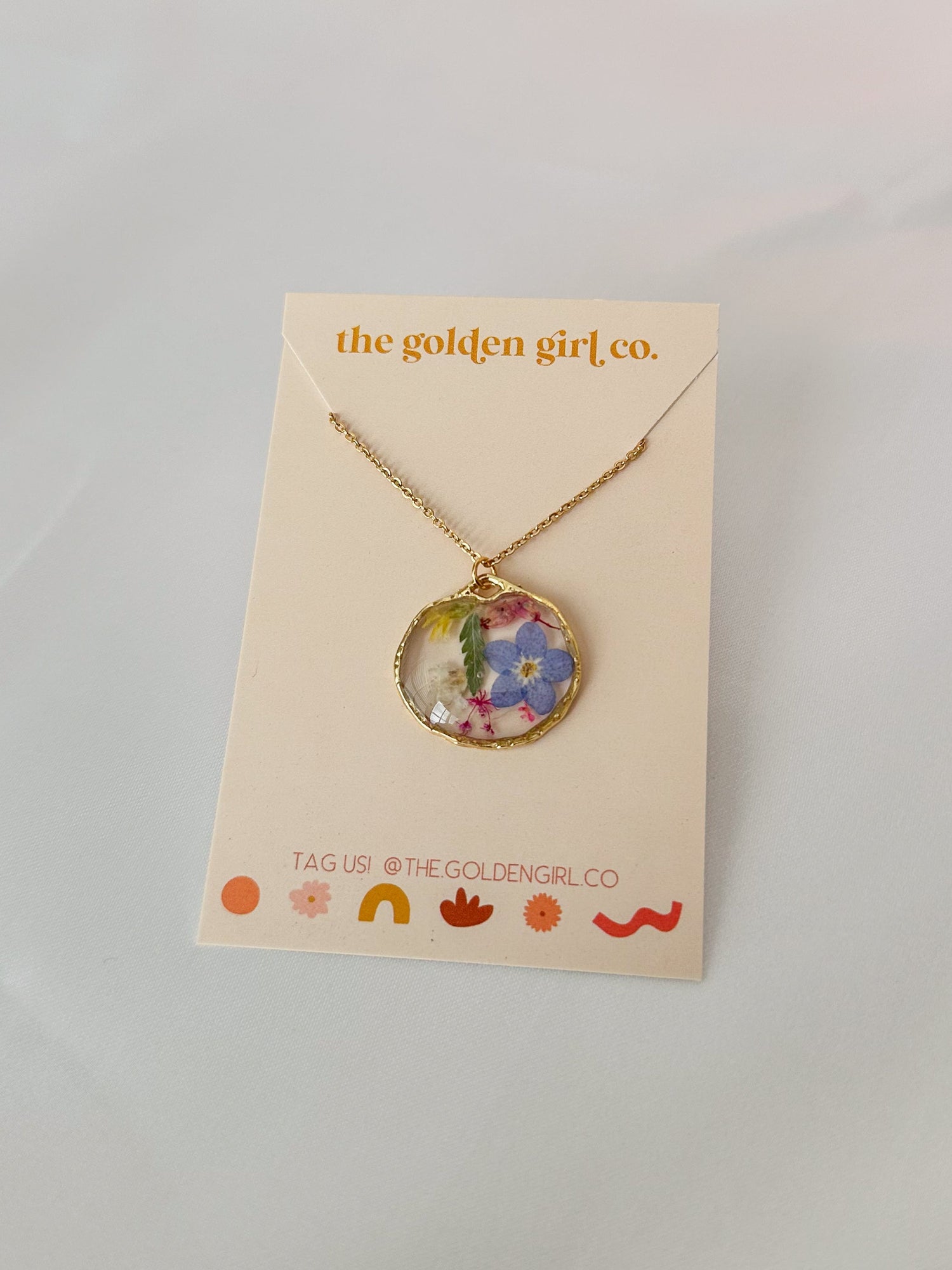 Real pressed flowers embedded in a circle pendant and secured on a dainty, 17.5 inch gold-plated chain.