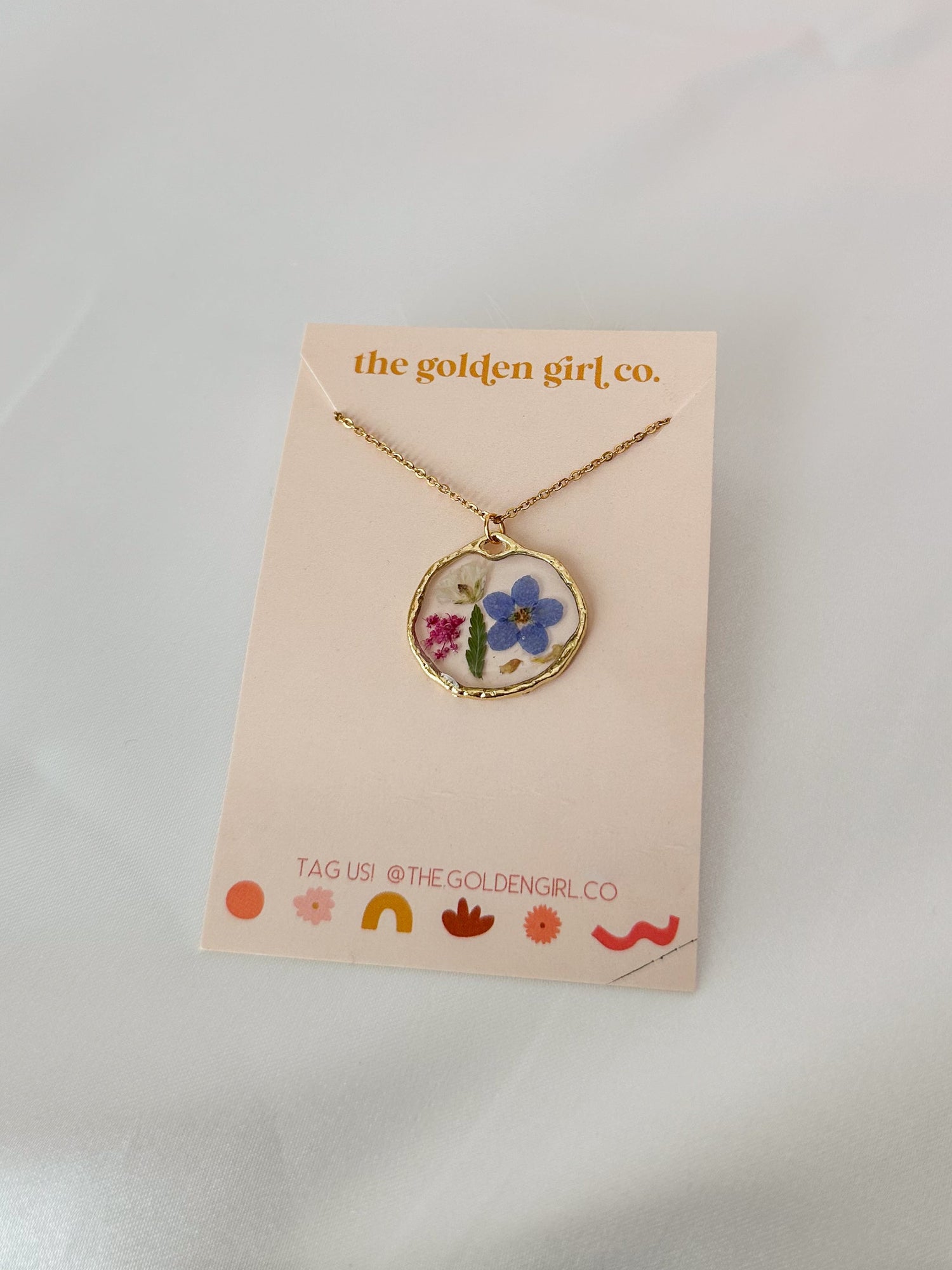 Real pressed flowers embedded in a circle pendant and secured on a dainty, 17.5 inch gold-plated chain.