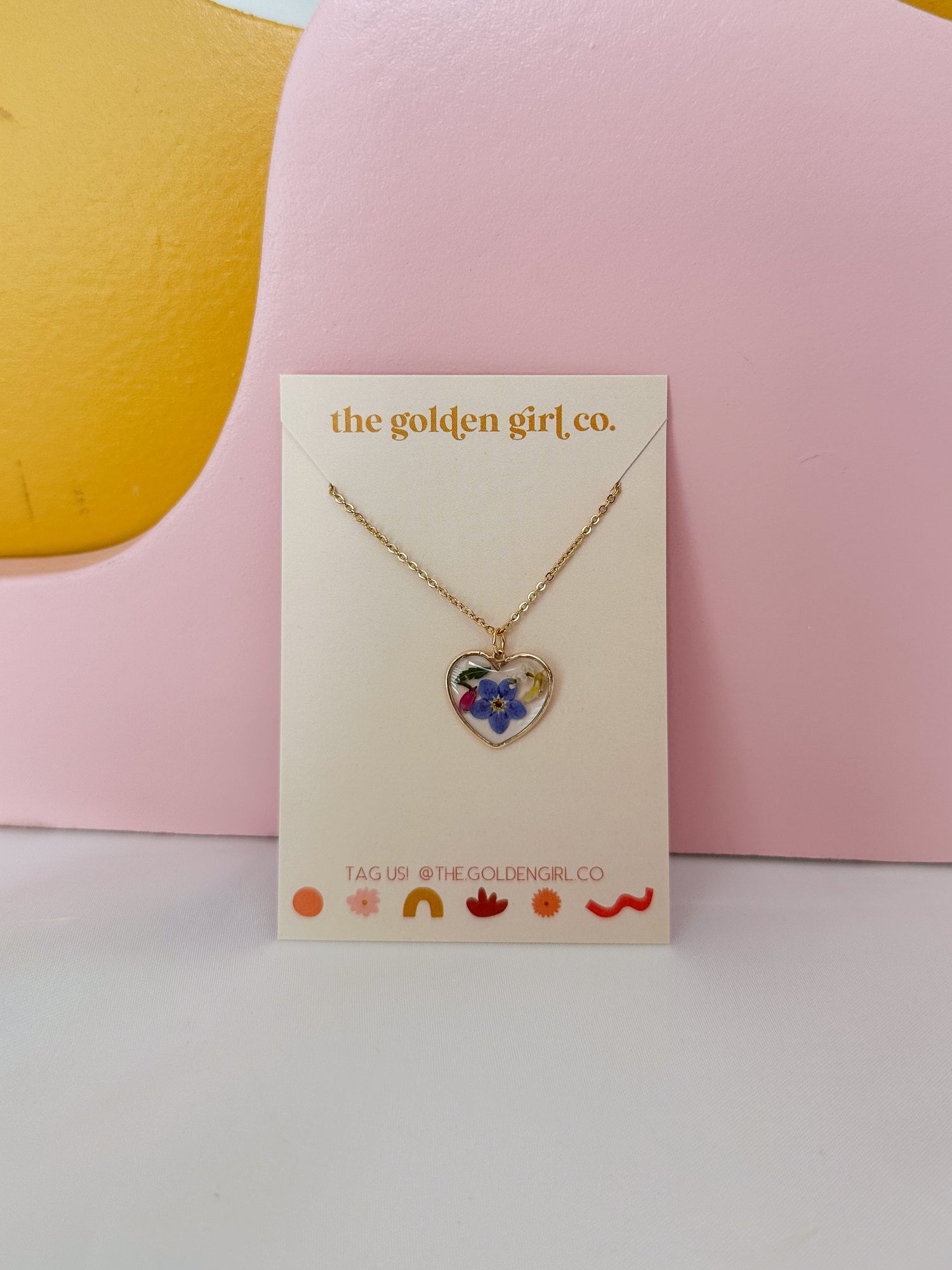 Real pressed flowers embedded in an heart pendant and secured on a dainty, 17.5 inch gold-plated chain.