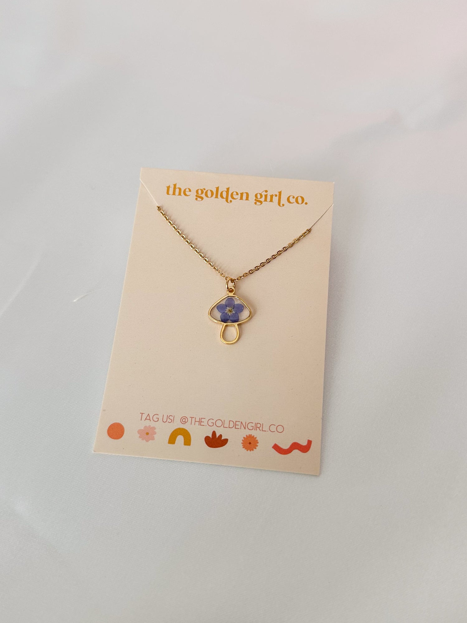 Real pressed flowers embedded in an oval pendant and secured on a dainty, 17.5 inch gold-plated chain.